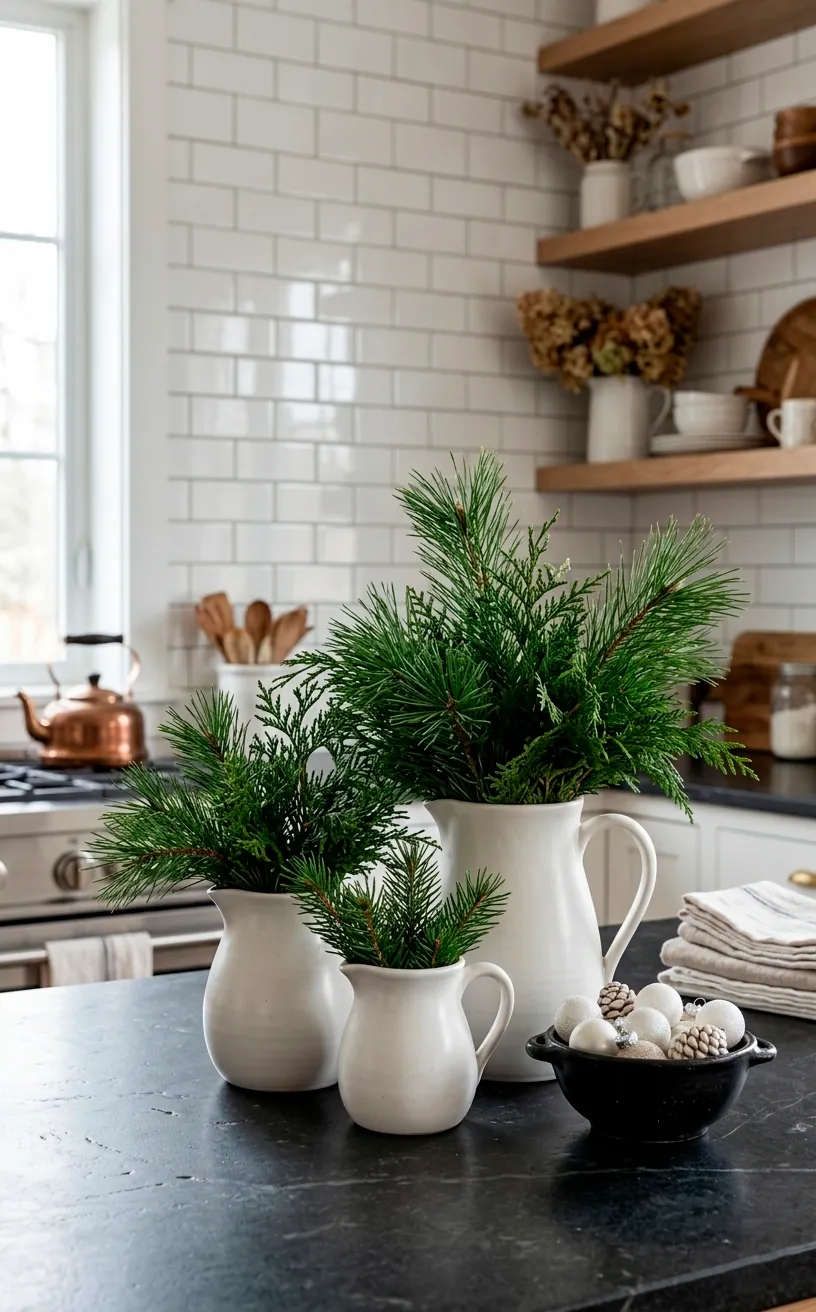 Empty white ceramic pitchers belong in the farmhouse hall of fame. During the holidays, I fill them with fresh cedar clippings or dried eucalyptus. The stark white against the deep green creates a look that is both fresh and timeless.