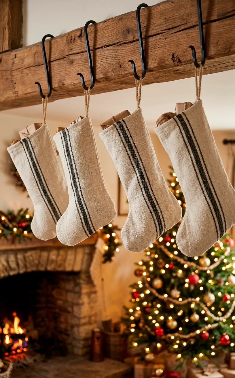 I’m obsessed with grainsack fabric because it brings so much texture without adding clutter. Look for white stockings with thin black ticking stripes. They look amazing hanging from a dark wood mantel or a row of black iron hooks. IMO, these are way better than those fuzzy, glittery stockings that shed everywhere.
