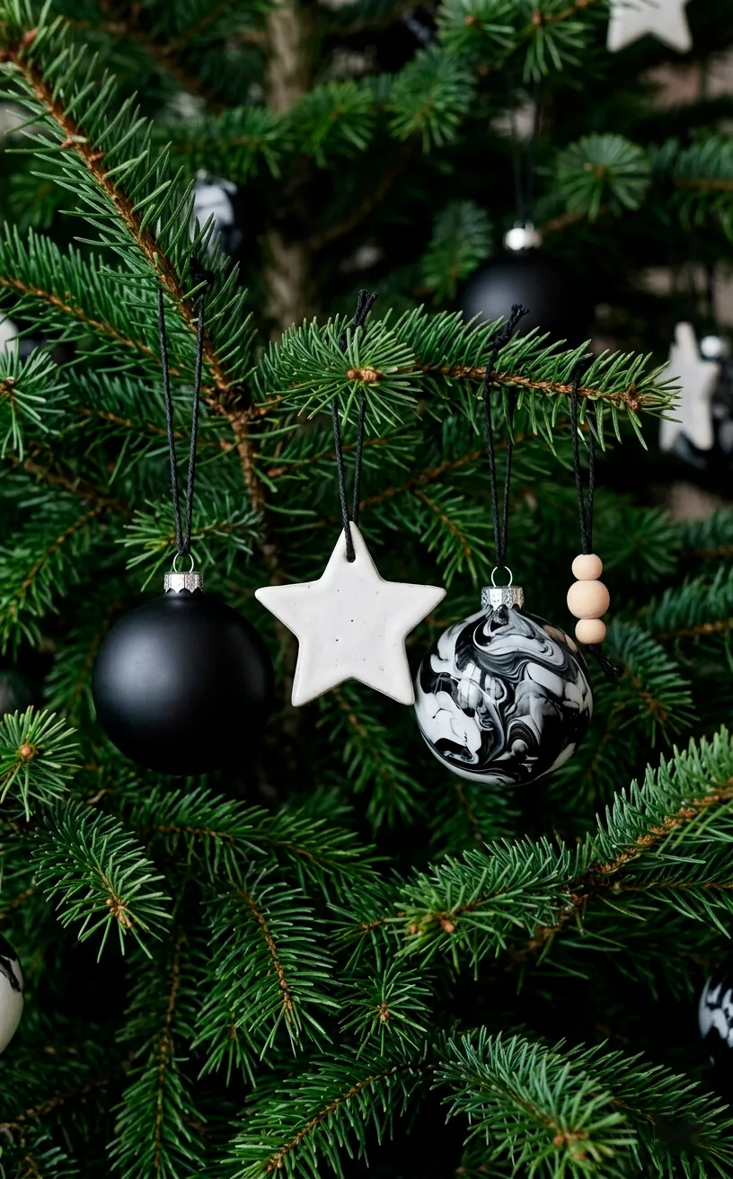 When it comes to the tree, I keep my ornament game strictly black and white. I mix matte black bulbs with glossy white ones and toss in some marble-patterned baubles for extra flair. This limited palette makes even a cheap tree look like it belongs in a high-end furniture catalog.