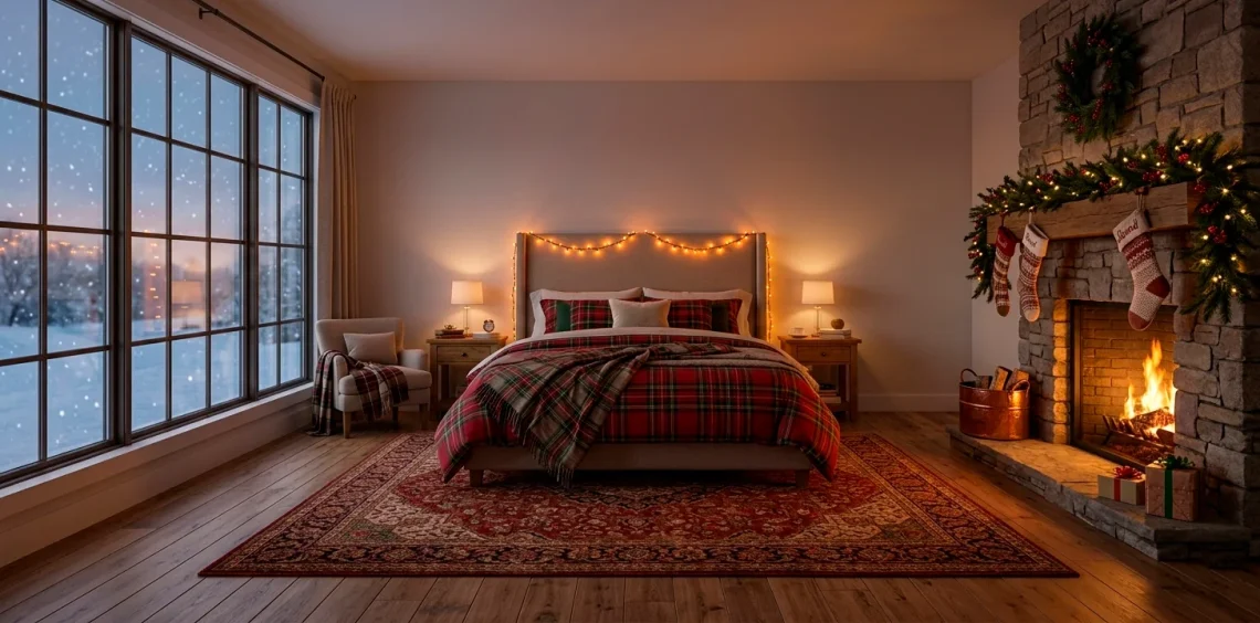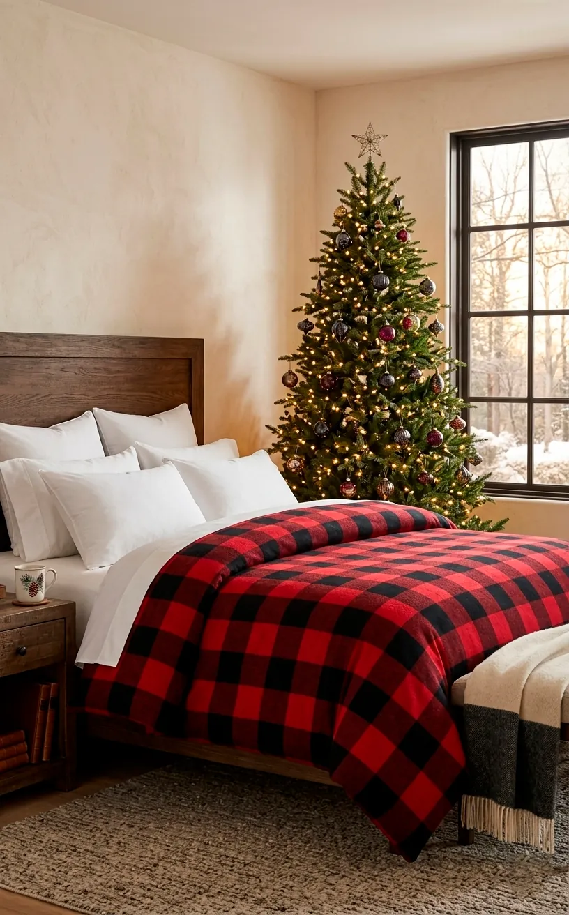 Nothing screams ‘holiday’ louder than classic red and black buffalo check. I swapped my boring white duvet for a heavy flannel one last year, and I haven’t looked back. It grounds the room with a bold, rustic energy that feels incredibly festive without trying too hard. Pair it with some pine-scented candles to really sell the mountain lodge vibe. Does anyone else feel like a lumberjack—in a chic way—when they see this pattern? The bold pattern creates an instant focal point that anchors the entire room’s holiday theme.