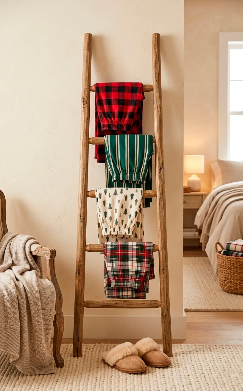 Believe it or not, your sleepwear doubles as decor if you’re creative. I hang my matching family flannel pajamas on a decorative wooden ladder in the bedroom corner. It adds a touch of whimsical, lived-in charm that feels super authentic and nostalgic. It’s basically functional art that you can wear to breakfast the next morning. Why hide those cute patterns in a dark drawer when they can boost the festive mood of the whole room? :/
