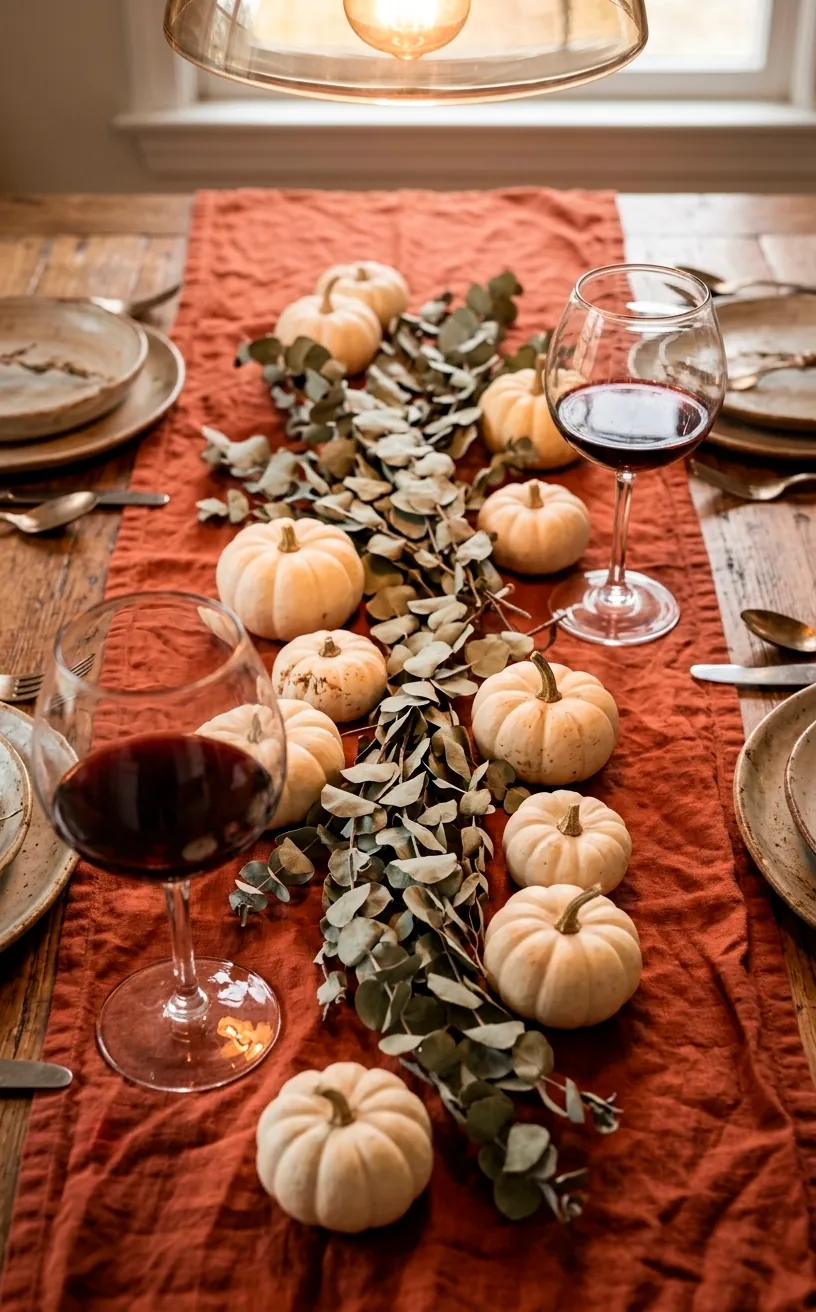 I suggest laying down a crumpled terracotta runner and scattering dried eucalyptus leaves along the center. The silvery-green of the eucalyptus against the burnt orange fabric looks incredibly high-end. It’s a color palette that feels sun-drenched even when it’s snowing outside.