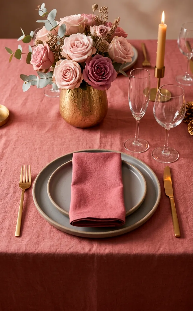 I recommend pairing this with champagne gold flatware. Unlike bright yellow gold, champagne gold has a softer matte finish that complements the pink tones perfectly. It feels festive without the loud ‘glitter’ vibe. Does this look feel too feminine? Not when you balance it with heavy, dark grey stone plates.