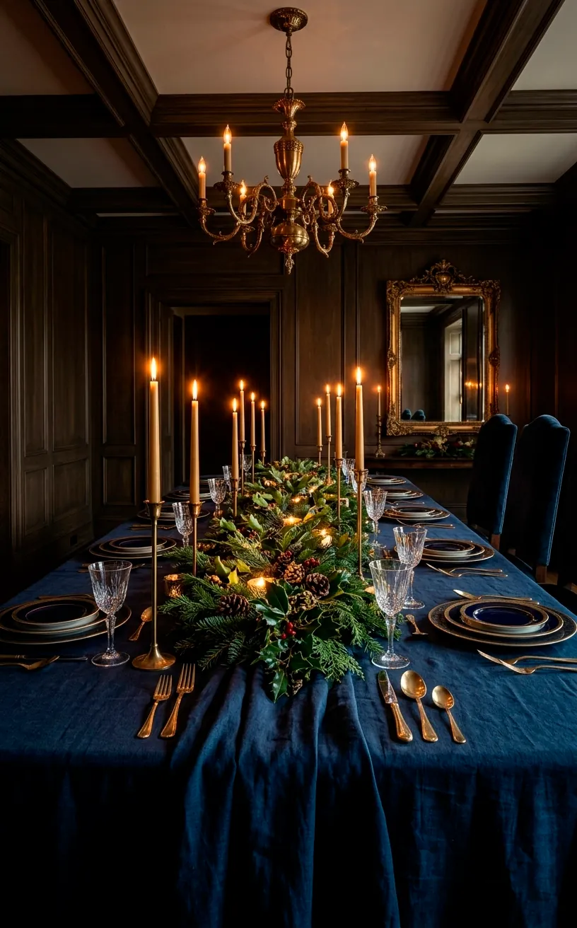When you add antique brass cutlery and candle holders, the whole table glows. The metallic gold tones pop against the dark blue fabric without feeling tacky or over-the-top. It’s the ultimate ‘grown-up’ holiday look that screams sophisticated host.