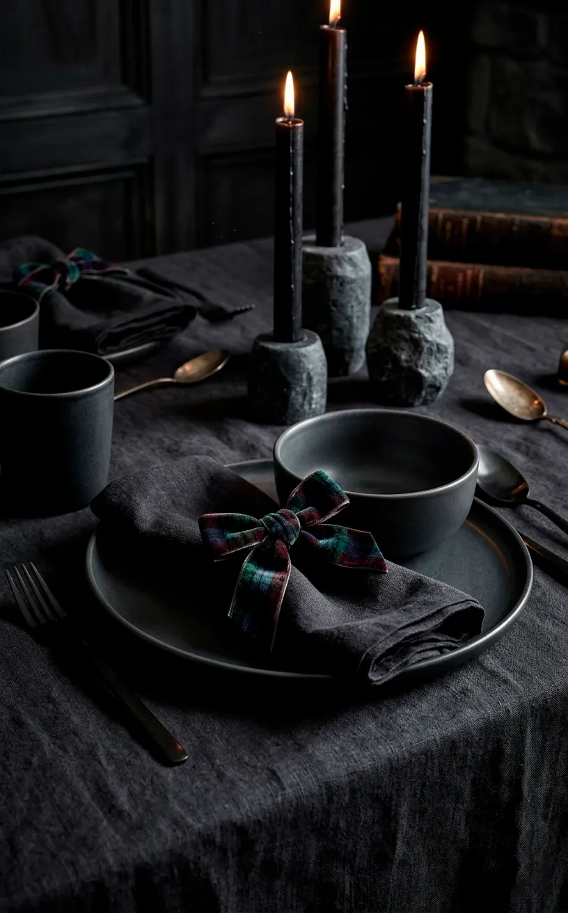 I love layering charcoal napkins over a textured grey tablecloth for a monochromatic look. To bring in the holiday cheer, add a small touch of velvet plaid ribbon around the napkins.