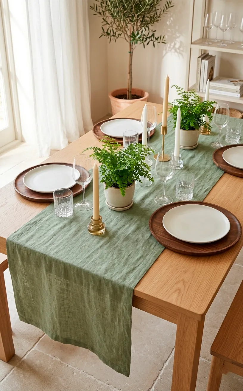 Sage green linen brings a soft, organic energy that feels fresh during the colder months. I love how this muted tone mimics the winter forest without hitting people over the head with ‘Christmas green.’ It feels modern, airy, and incredibly peaceful. Pair this with raw walnut wood chargers or a large wooden dough bowl filled with fruit. The contrast between the soft fabric and the hard, dark wood grain creates a tactile experience your guests will notice the second they sit down. If you want a more handcrafted look, consider adding modern macrame: stylish guide to DIY holiday decor.