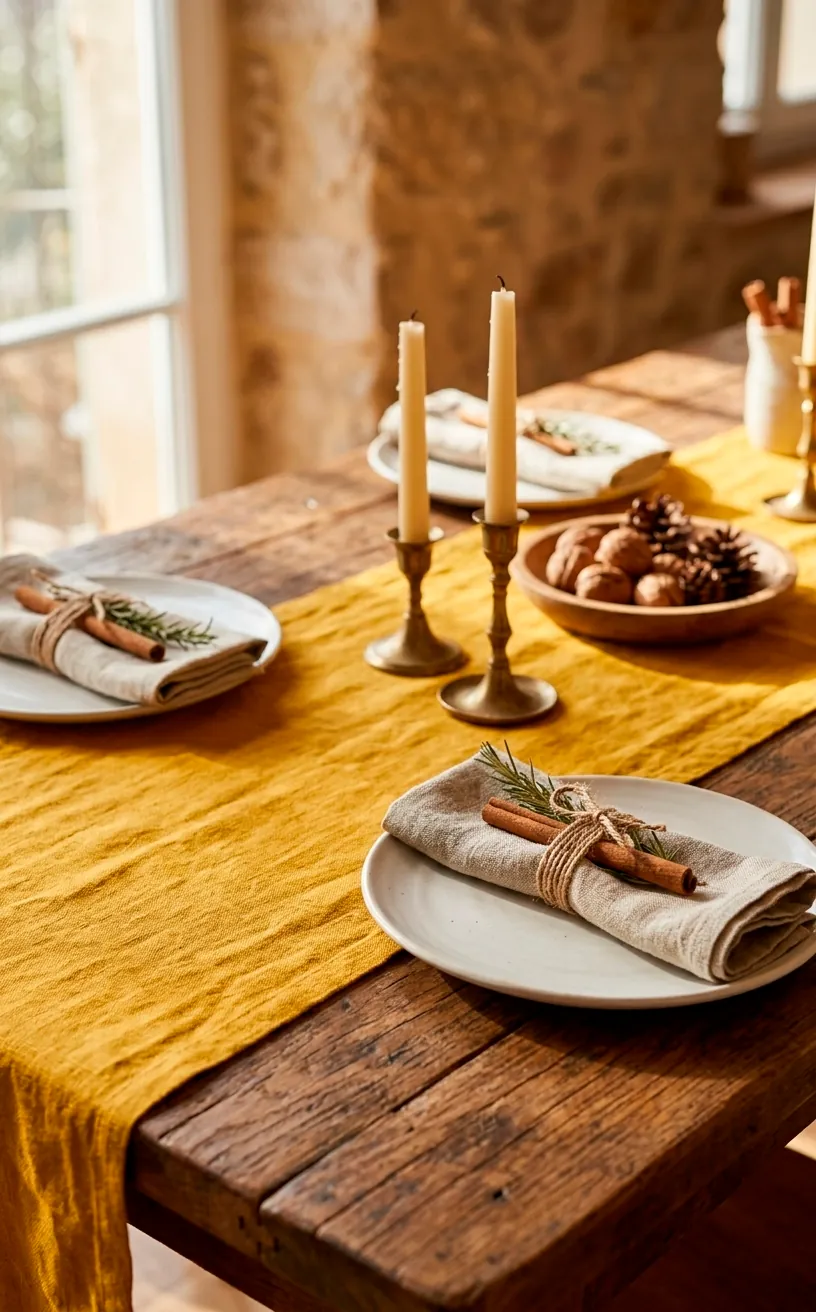 Mustard yellow linen adds a pop of ‘happy’ to the table. It’s an unexpected holiday color that feels like a warm hug. I usually keep the rest of the decor very simple when using such a bold fabric. Wrap your napkins in rustic twine and tuck in a cinnamon stick for a scent that matches the visual warmth. It’s simple, effective, and looks great in photos. 💃