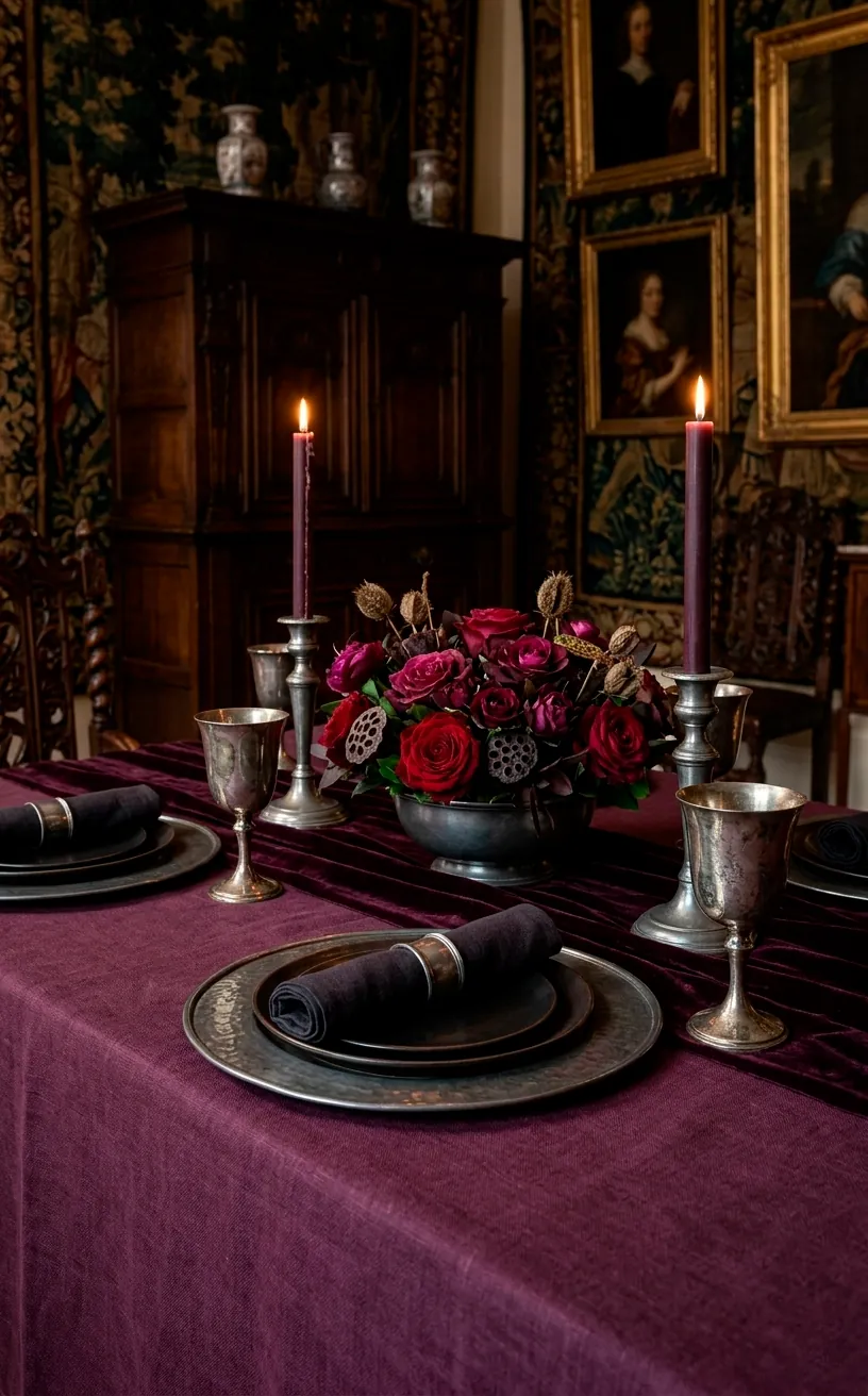 I suggest using pewter plates or chargers to give the table an old-world, castle-like feel. It’s dramatic without being loud.