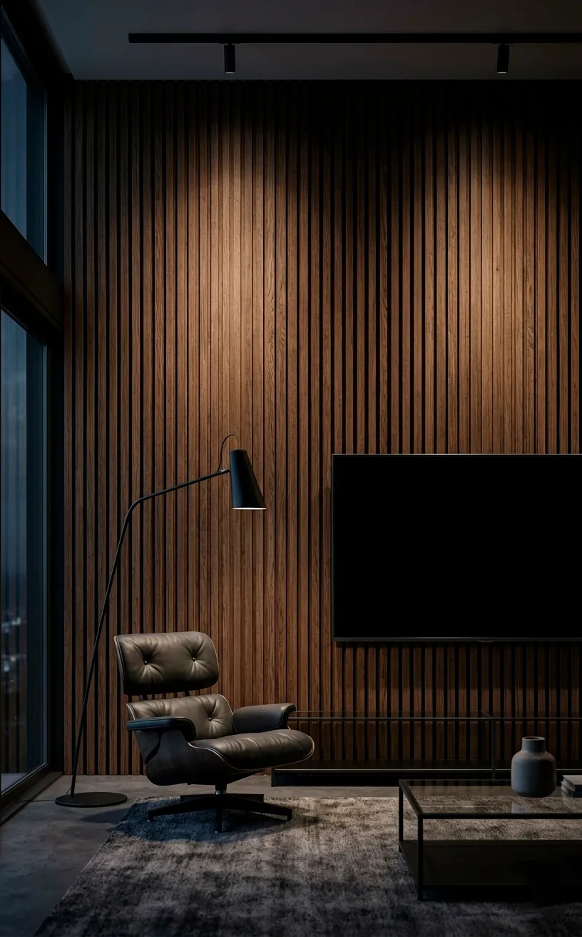 Wood slats bring a much-needed organic warmth to the cold world of glass and metal. These vertical lines draw the ceiling upward, making your room feel surprisingly tall. I love how the shadows between the slats create depth without adding clutter.