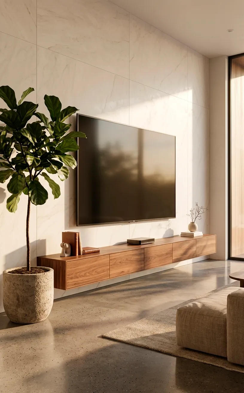I absolutely hate seeing a tangled mess of cords hanging under a screen. It looks like a robotic octopus died back there. A floating console solves this problem instantly while keeping your floor clear. Mount a long, slim cabinet directly to the wall about a foot below your TV to create a sense of weightlessness. This trick makes even small apartments feel like sprawling penthouses because the continuous floor line fools the eye. I personally recommend a matte finish to avoid distracting reflections from the screen above. FYI, check your wall studs before you start drilling, or your expensive soundbar might end up on the floor! 😉
