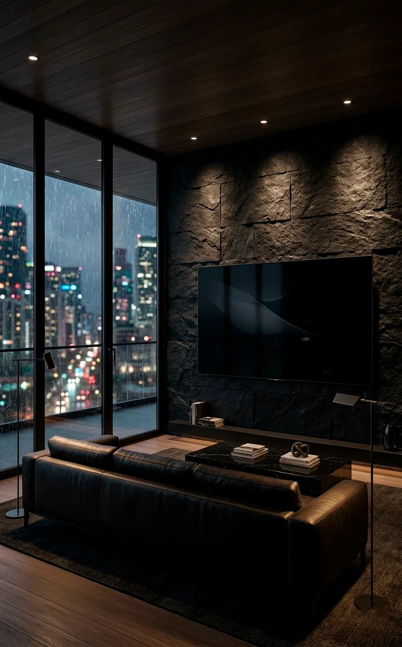 Black slate or charcoal limestone creates a powerful, masculine backdrop. It makes the colors on your screen pop like crazy during movie night.