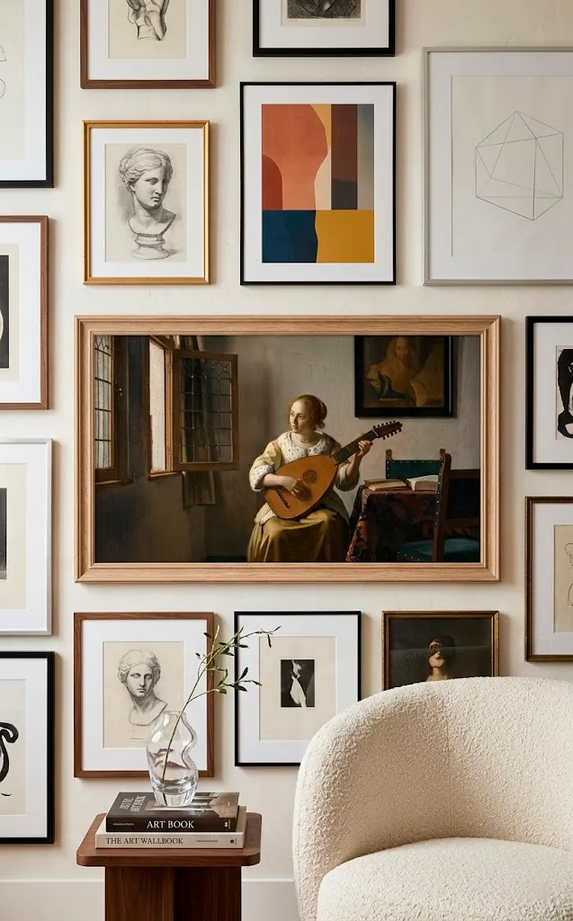 You can surround the screen with actual physical frames to create a gallery wall. I suggest mixing different sizes and art styles to keep it looking authentic rather than staged. This approach blends the technology into your lifestyle so seamlessly that guests often ask where the TV is.