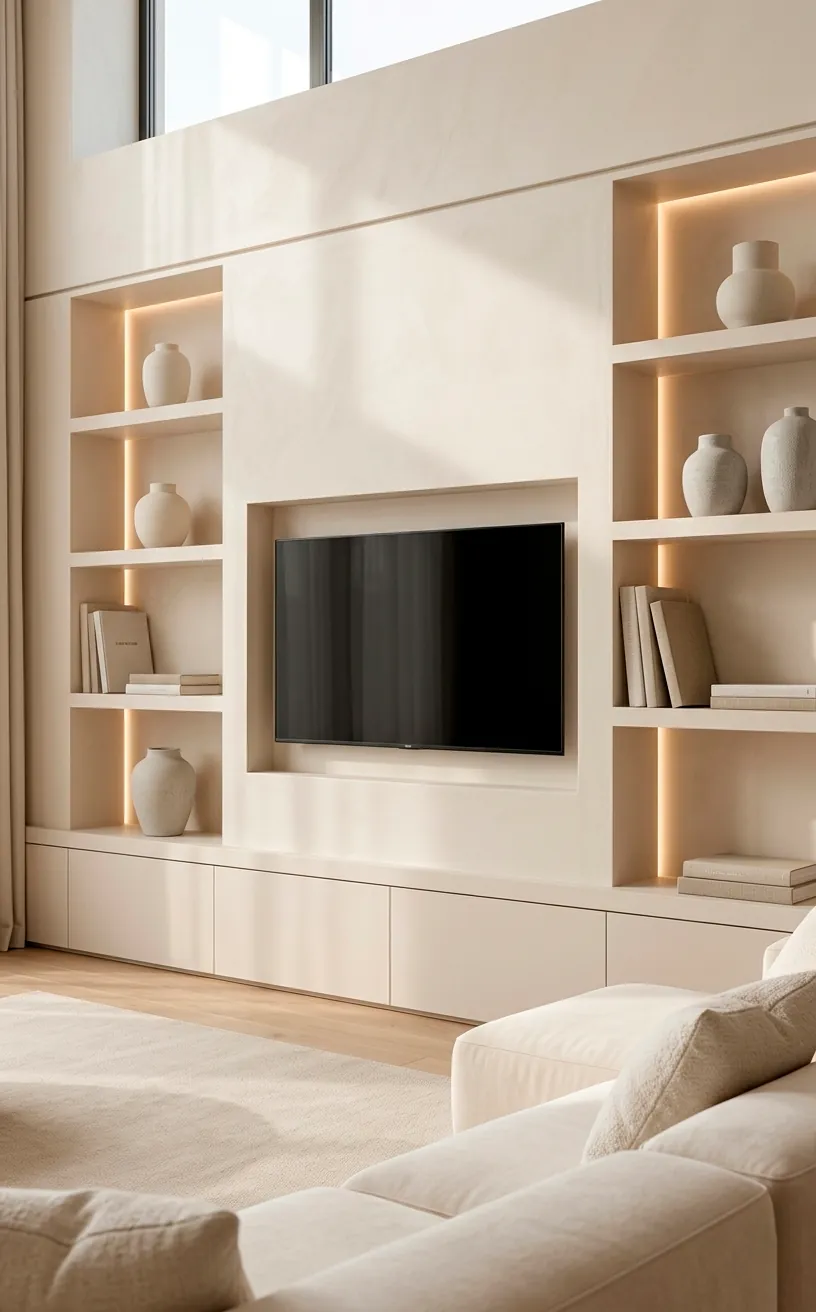Recessing your TV into the wall creates a flush, custom look that screams ‘architect-designed.’ I love how an alcove makes the TV feel like a part of the house’s bones rather than an afterthought. You can paint the inside of the nook a darker shade than the surrounding wall to add even more depth. This setup also provides the perfect excuse to build in some custom shelving for your favorite decor pieces. Just make sure you leave enough room for your next TV upgrade, because those screens only seem to get bigger every year! Keep the styling simple; three or four high-quality objects look much better than a dozen tiny knick-knacks that just collect dust. It’s all about that clean, intentional vibe that makes your living room feel like a sanctuary rather than a storage unit.
