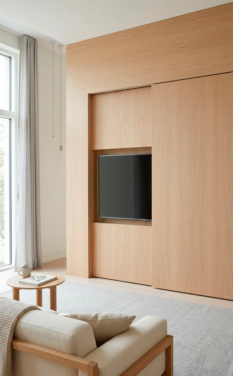 Sometimes, the most modern thing you can do is hide the technology altogether. Sliding panels allow you to tuck the TV away behind a beautiful piece of art or wood paneling when you aren’t using it. This is perfect for those who want their living room to be a place of conversation first and entertainment second. I love the ‘reveal’ moment when the panels glide open to show the screen. Use a motorized system if you’re feeling fancy, or a simple manual track for a more tactile experience. It’s the ultimate way to maintain a clean, uncluttered aesthetic without sacrificing your Sunday football rituals. Plus, it keeps the kids from touching the screen with their sticky fingers! 😉 This design choice proves that you can have your tech and your high-end decor too, without one stepping on the other’s toes.