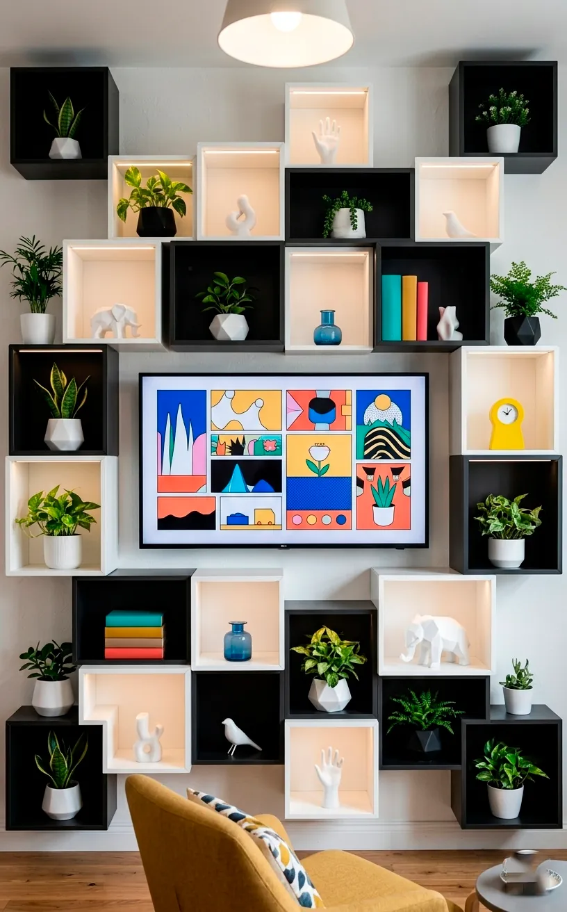Arrange open box shelves in an irregular pattern around your TV to create a dynamic, energetic look. This gives you plenty of space to display your personality through books, plants, and travel souvenirs.