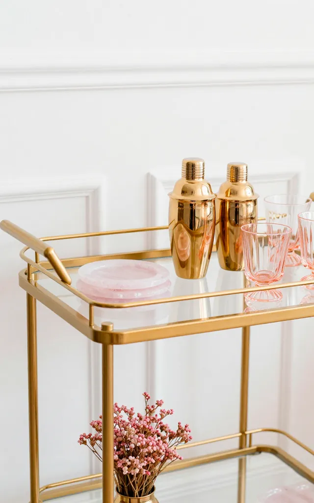 Think of this as the ‘jewelry’ phase of your room design. Polished gold has a high-shine reflective quality that acts like a mirror for your rose quartz accents. I love using rose quartz coasters on a gold-rimmed bar cart. Does anything say ‘I have my life together’ more than organized cocktail supplies? The shiny gold frames the natural, crystalline pink of the stone beautifully. I found that small gold figurines nestled near rose quartz crystals create a balanced, intentional look on any shelf. It’s subtle, high-end, and effortlessly chic.