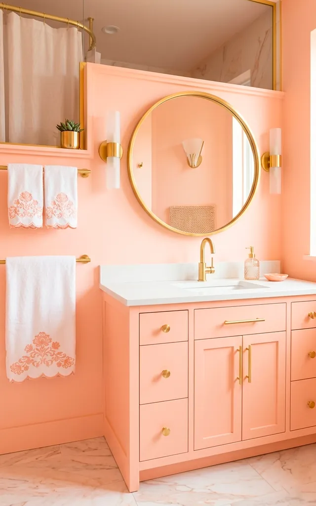 For a sun-drenched, warm vibe, peach pink and yellow gold are unbeatable. The yellow gold intensifies the orange notes in the peach, making the room feel like a permanent summer. I love using yellow gold hardware on peach-colored bathroom vanities. Doesn’t everyone want their morning routine to feel like a tropical vacation? Pair this with peach towels and a yellow gold mirror frame. I found that gold-rimmed glass jars filled with peach soaps add a sweet, functional touch to the counter. It’s bright, cheerful, and incredibly welcoming.