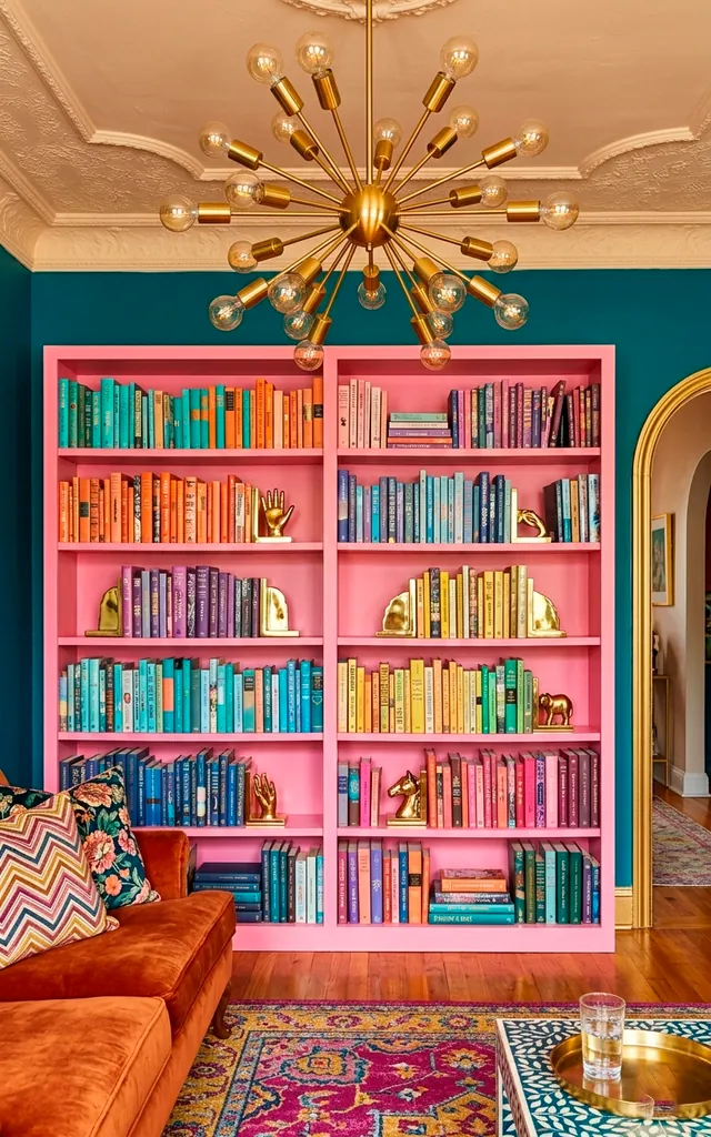 If you are a maximalist at heart, bubblegum pink and high-shine gold is your playground. This is the ‘Barbiecore’ aesthetic refined for an adult apartment. I use high-shine gold bookends on a bubblegum pink bookshelf to create a bold statement. Who says you have to play it safe? The brilliant reflection of the gold makes the bright pink look purposeful rather than accidental. I suggest adding a high-shine gold chandelier in a room with pink accents. It’s loud, it’s proud, and it’s undeniably chic. Go big or go home, right?
