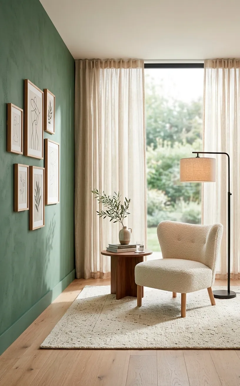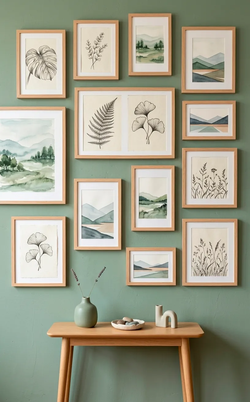 A blank sage wall is a missed opportunity for a gallery. I find that botanical prints or abstract landscapes in light wood frames look incredible here. It reinforces the whole nature theme without being too literal.