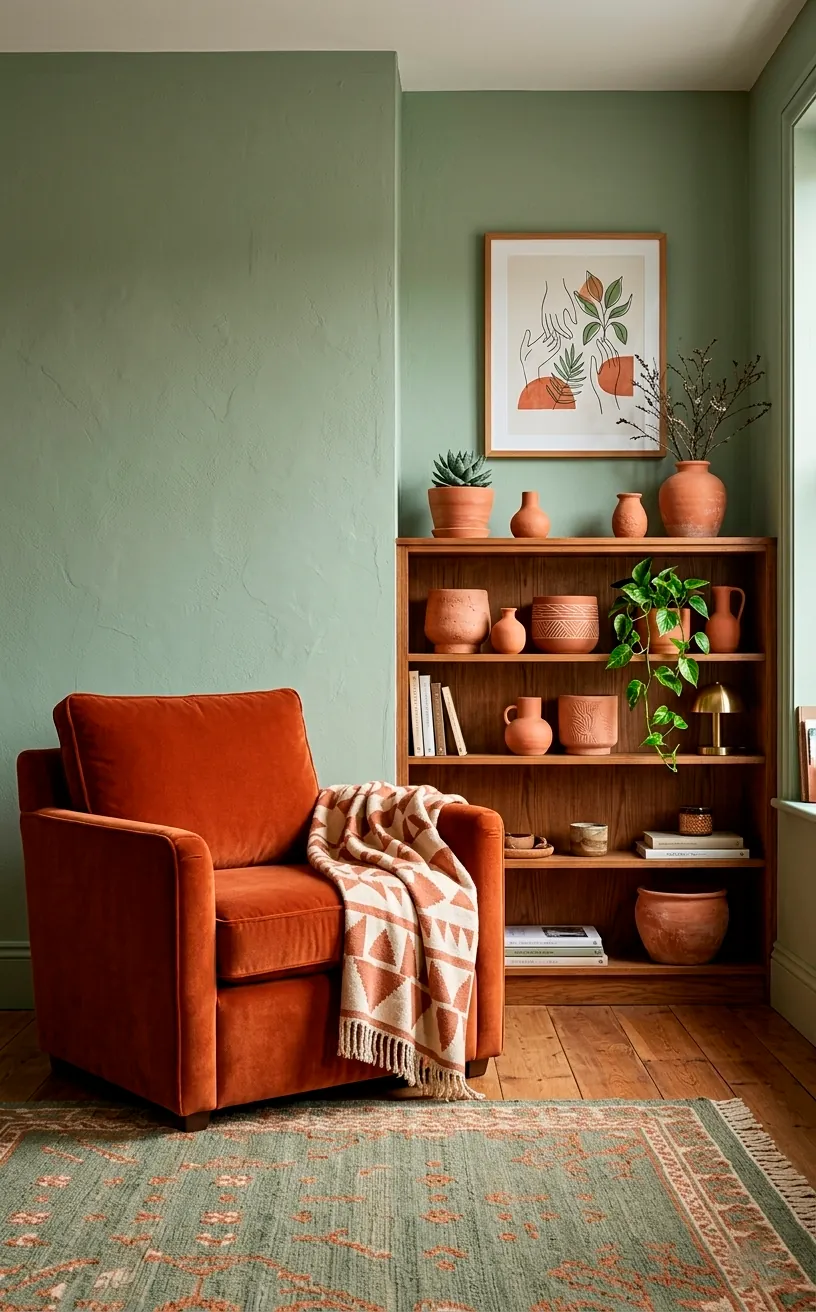 If you want to add a bit of heat to your cool green room, terracotta is your best friend. These two colors are literally neighbors in nature, so they vibe perfectly.