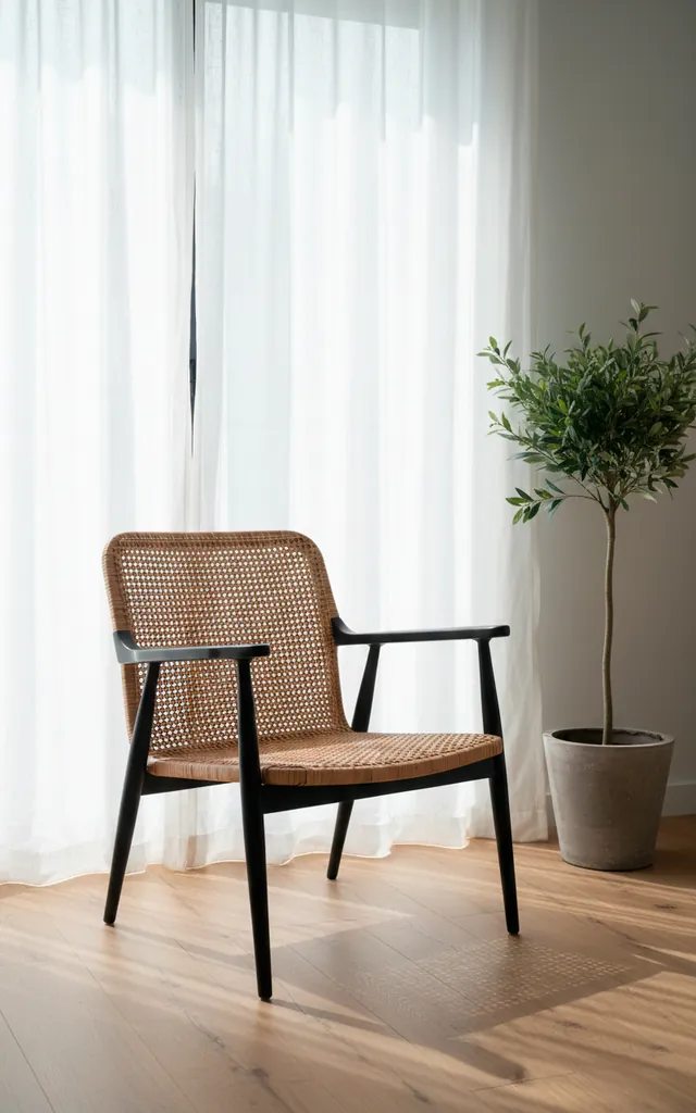 Contrast is the secret sauce of a great Japandi room. I pair a rattan armchair with a matte black frame to give the space some “edge” without losing the cozy vibe. The black frame provides a visual anchor, while the rattan keeps it feeling organic. FYI, this is always the first chair guests gravitate toward.