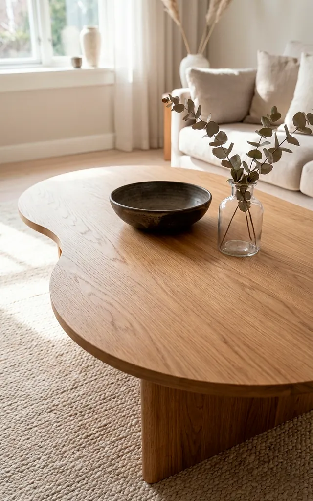 Square tables are fine if you enjoy bumping your shins, but a kidney-shaped oak table changes the whole energy of the room. The organic curves break up the harsh straight lines usually found in modern architecture. I love how the light oak grain brings a bit of the outdoors inside. IMO, this is the easiest way to soften a cold room. 🙂