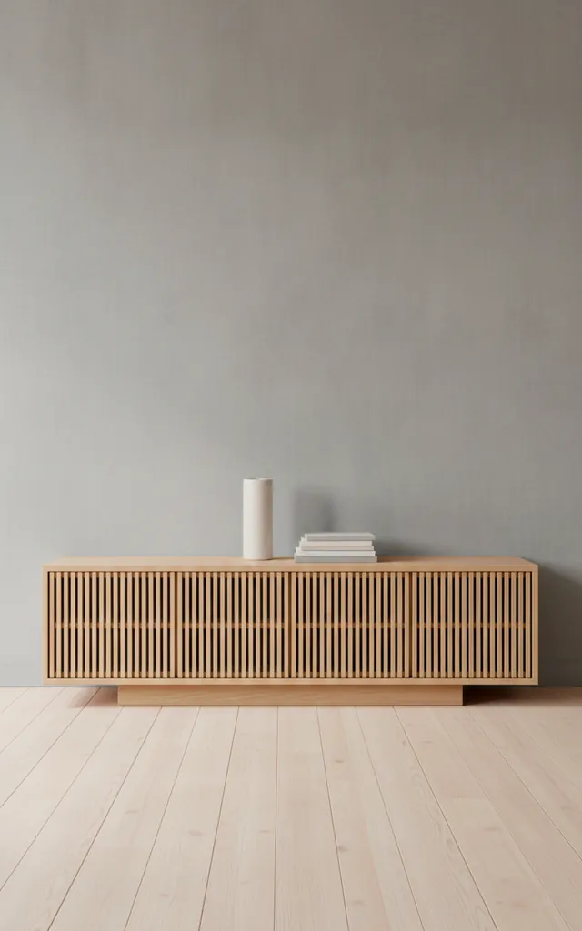 Clutter is the ultimate mood-killer for any “refined” room. I use a slat-door sideboard to hide my mess (looking at you, tangled charging cables). The vertical slats create a beautiful rhythmic pattern that makes the wall look taller. It looks much better than a boring, flat cabinet door.