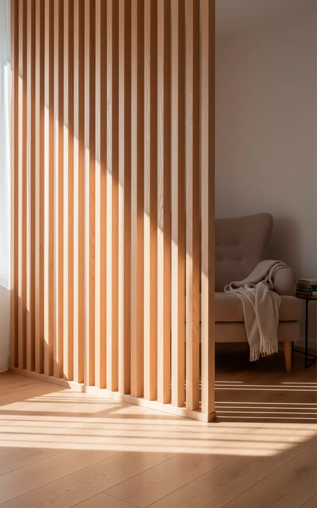 If you have an open-plan space, you need a wooden slat room divider. I use one to separate my workspace from my relaxing area without blocking the light. It creates a “secret” nook feeling that is incredibly cozy. Ever wondered how to add privacy without building a whole new wall?