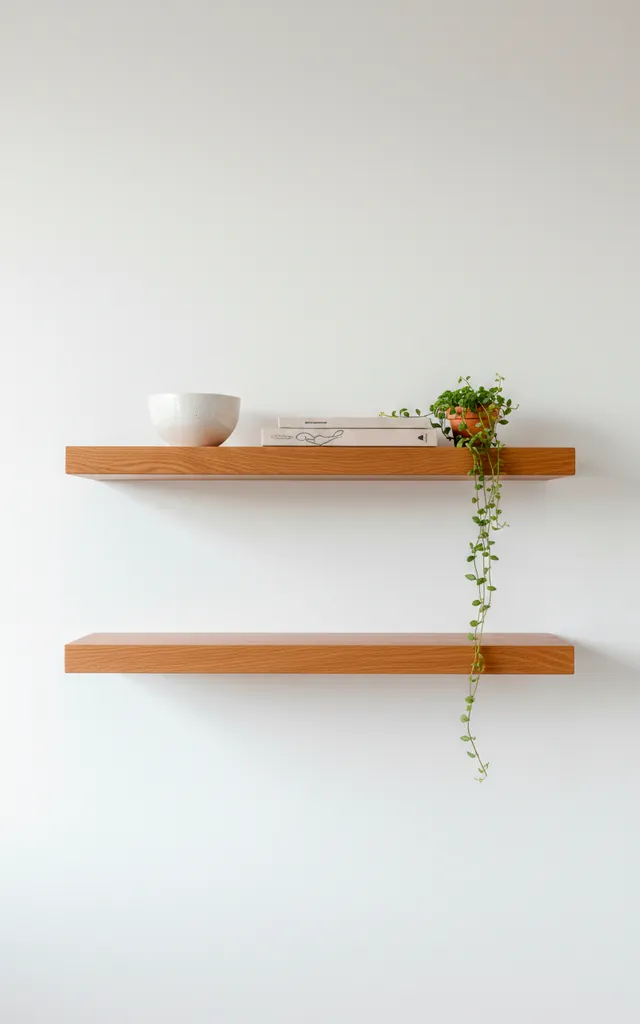 Bulky bookshelves can make a room feel claustrophobic. I swapped mine for floating oak shelves to clear up the floor space. They look like they’re growing right out of the wall. Displaying just a few items makes your room look curated rather than cluttered. Ready to give your walls some breathing room?