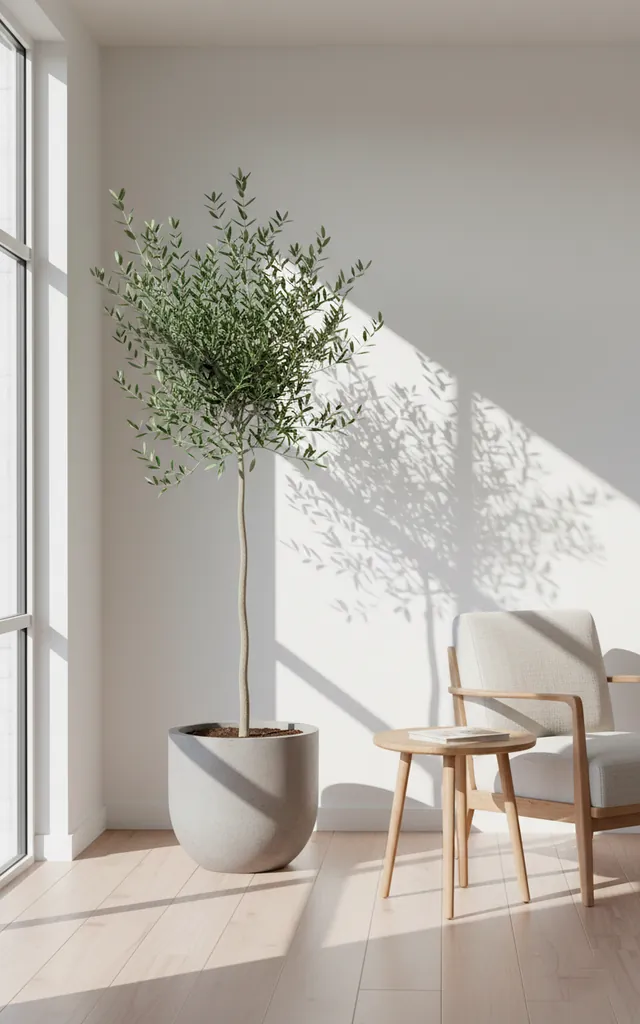 Every Japandi room needs a “living” element. I chose a slender olive tree because the silvery-green leaves look incredibly sophisticated against neutral walls. It adds life to the corner without being overwhelming like a massive jungle plant. Plus, the grey concrete pot adds a nice industrial touch.