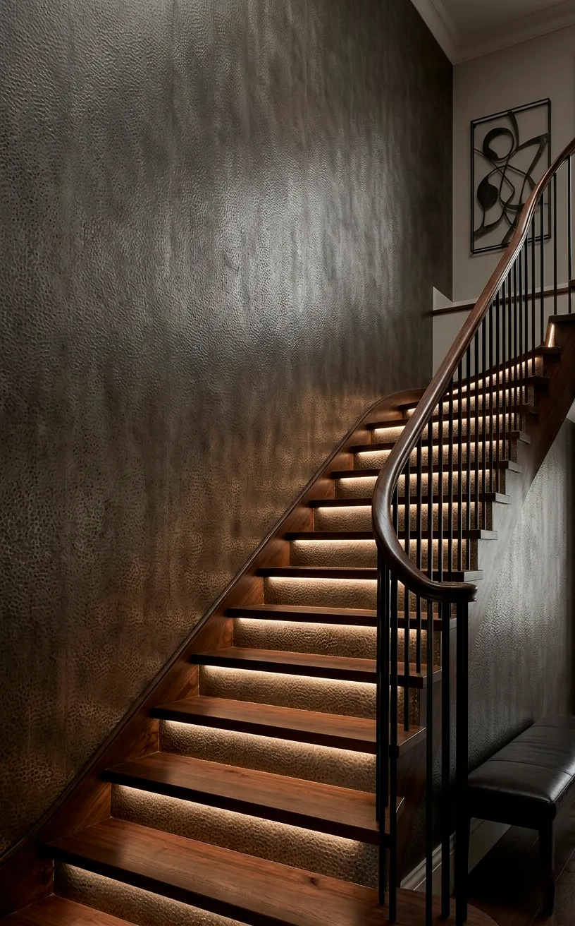 Let’s get a little flashy, shall we? Textured metallic wallpaper is the perfect middle ground for someone who wants shimmer without the heavy lifting of actual metal sheets. IMO, a dark pewter or burnished gold adds insane drama when the afternoon sun hits the stairwell. It’s definitely a bold move, but isn’t that the point? You’re not trying to blend in. Just make sure your wall is perfectly smooth before hanging this stuff, or every little bump will scream for attention. Have you ever seen a wall look more like a piece of jewelry? It’s pure glamour.