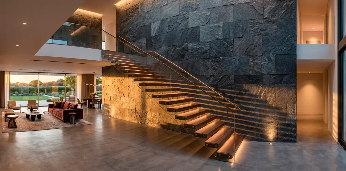 Stacked stone brings the outdoors inside in the best way possible. Imagine walking up to bed past a wall of rugged slate or limestone every night. It feels solid, permanent, and expensive.