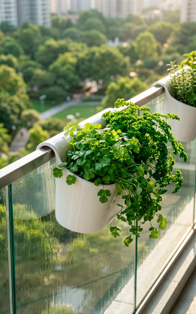 I used to waste so much floor space until I realized the railing is basically a free shelf. Saddle-style planters sit directly on top of the bars, keeping your herbs at eye level and out of the way. I love how these catch every bit of morning sun while leaving room for my morning coffee chair.