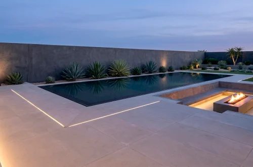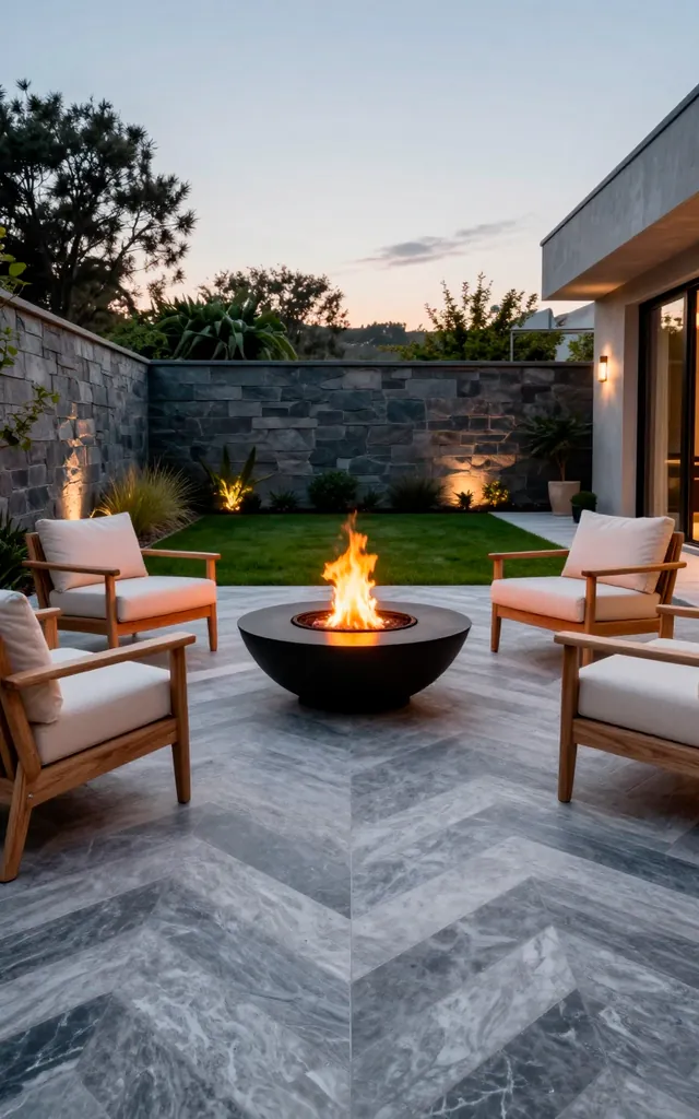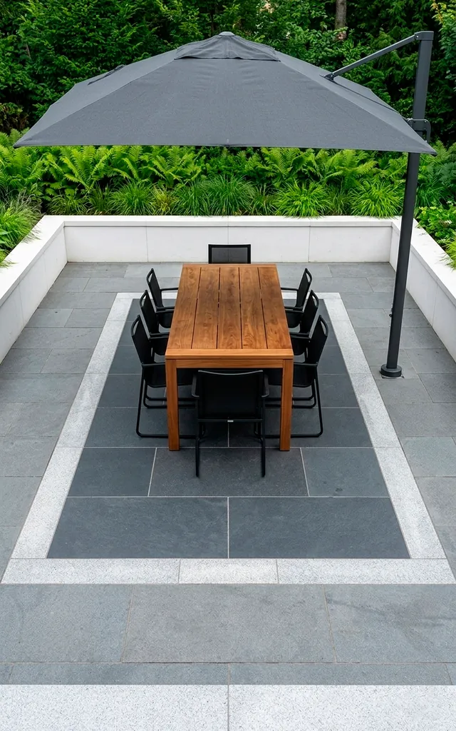 A layout within a layout feels like patio inception, doesn’t it? You use different stone colors or textures to create ‘rooms’ without adding actual walls. I love how a darker rectangle of slate defines the dining area while lighter stones surround the rest. It keeps your outdoor space organized and prevents that ‘sea of concrete’ look that ruins so many yards. Plus, it gives you a clear excuse to buy that expensive outdoor rug you’ve been eyeing. Your furniture suddenly has a ‘home’ instead of just floating aimlessly in space. Practical and chic!