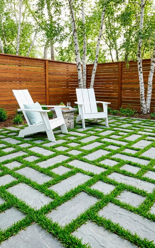 If you spent your childhood playing Tetris, this layout will speak to your soul. L-shaped pavers fit together in a repetitive, interlocking grid that feels both retro and futuristic. The pattern breaks the monotony of a flat yard by creating tiny pockets for grass or moss to grow between the joints. This ‘living’ patio looks much softer than a solid slab of stone. I think it bridges the gap between nature and architecture perfectly. Want a yard that looks like a high-end puzzle? This is definitely the winner for those who crave structure with a touch of green.