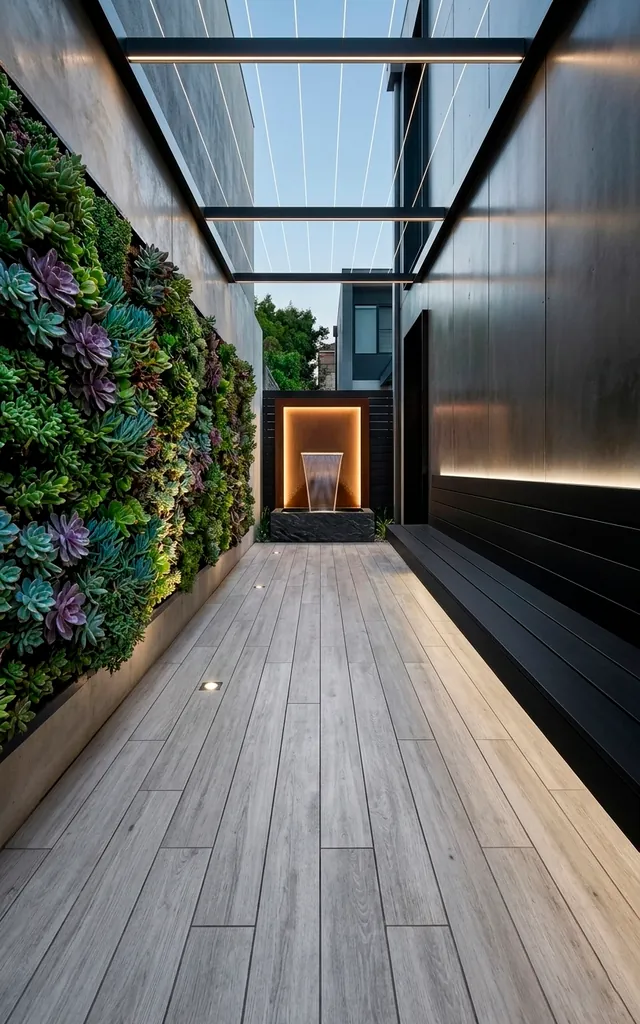 Long, slim pavers draw the eye toward the horizon like a literal runway. They make narrow yards look incredibly long by emphasizing the horizontal axis. You should pair these with vertical gardens or tall bamboo to maximize that ‘secret garden’ vibe. I’ve noticed that this layout works wonders for townhomes where space is at a premium. The clean, unbroken lines create a sense of order that calms the mind after a long day at work. It’s simple, it’s effective, and it’s surprisingly easy to install. Who knew rectangles could be this dramatic?