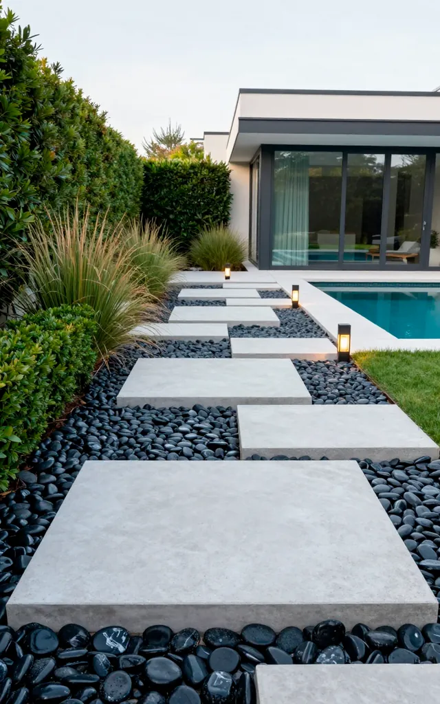 Ever wanted to feel like a giant? Large-format concrete pads look like massive stepping stones when you surround them with dark gravel. This design tricks the eye into seeing more depth, making your yard feel like a boutique hotel lounge. FYI, this layout also saves you from the nightmare of perfectly leveling 500 tiny bricks. You just place the big ones and let the rocks handle the rest. I find the contrast between the smooth grey concrete and jagged black stones incredibly satisfying. Does your current patio feel this sophisticated? Probably not yet!