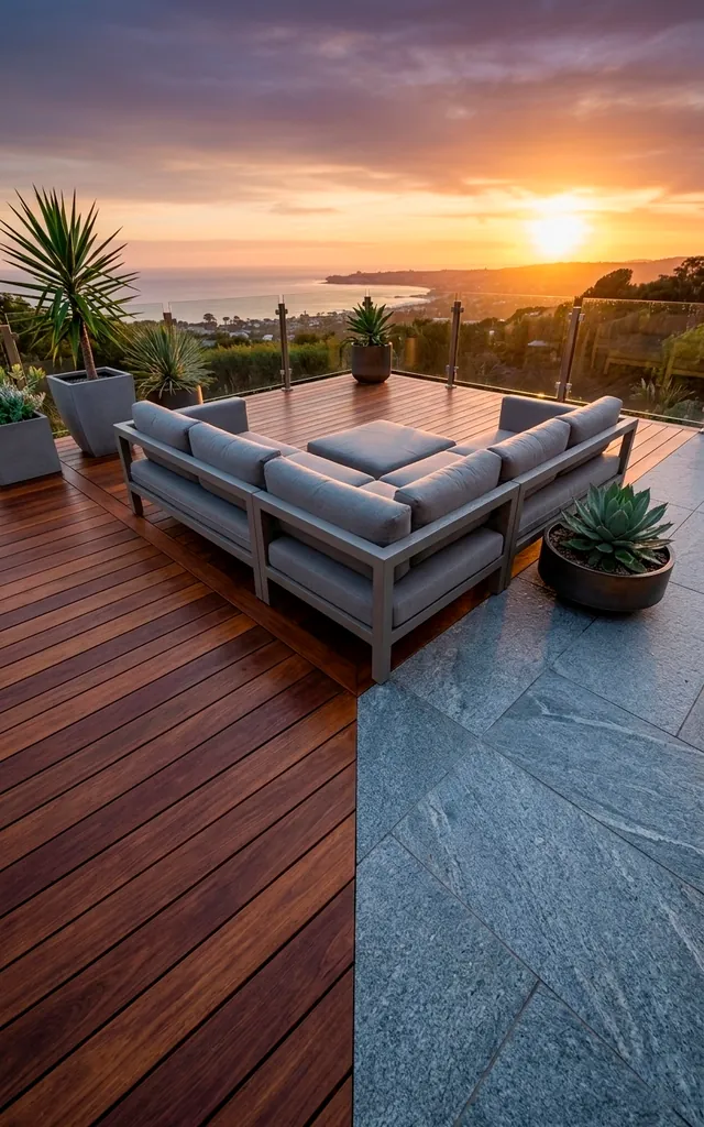 Combine warm wood decking with cold stone for the ultimate texture contrast. The wood brings a cozy feel while the stone provides the modern edge your yard deserves. I love how these materials play off each other, especially when you align the joints perfectly. It feels like a high-end resort in your own backyard. You don’t have to choose just one look when you can have both! This layout defines different zones—like a sunbathing deck and a stone fire pit area—with zero effort. Ready to start digging and level up your outdoor game? 🙂