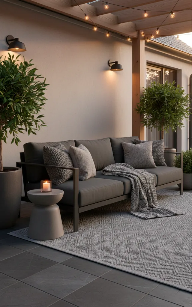 A slate porch can feel cold without the right fabrics to break up the stone. I always layer a chunky woven rug over the pavers to soften the hard edges. The interplay between the smooth slate and a rough jute or polypropylene weave adds immediate warmth. Does your current setup feel a bit sterile? Adding high-quality outdoor pillows in shades of graphite and silver solves that instantly. This approach makes the space feel like a true extension of your indoor lounge.