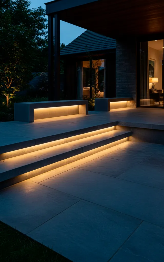 Lighting makes or breaks a contemporary porch after the sun sets. I prefer hidden LED strips tucked under the lip of slate steps or built-in stone benches. This wash of light emphasizes the natural variations in the grey stone without blinding your guests. FYI, lighting the floor rather than the ceiling creates a much more intimate, lounge-like atmosphere. It turns your porch into a private sanctuary the second the moon comes out. Don’t you think the glow looks incredibly high-end?