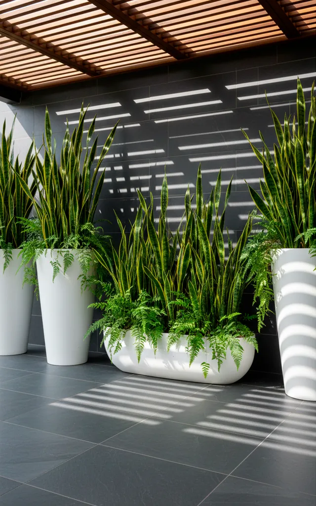 Nothing pops against slate grey like vibrant green foliage. I found that placing white minimalist planters with snake plants or ferns creates a striking visual punch. The dark grey background makes the green hues appear more saturated and alive. Ever wondered why professional landscapers love this specific combo? It creates a high-contrast look that feels expensive even if you’re on a budget. I suggest using different heights to keep the eye moving across your porch.