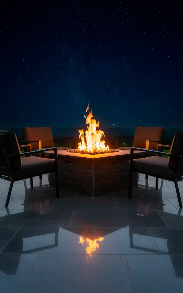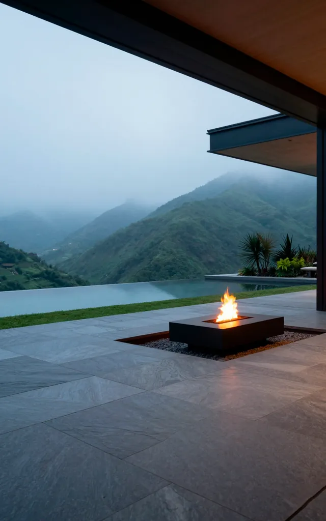 A central fire pit anchored by slate stone creates a natural gathering spot for late-night chats. I built a custom square fire table using matching slate tiles to keep the design cohesive and sleek. The flickering orange flames look incredible against the deep, moody grey background. It becomes the heart of the home during the cooler months. Wouldn’t you love to host a cocktail hour around this setup? It’s basically like having a high-end ski resort patio in your own backyard.