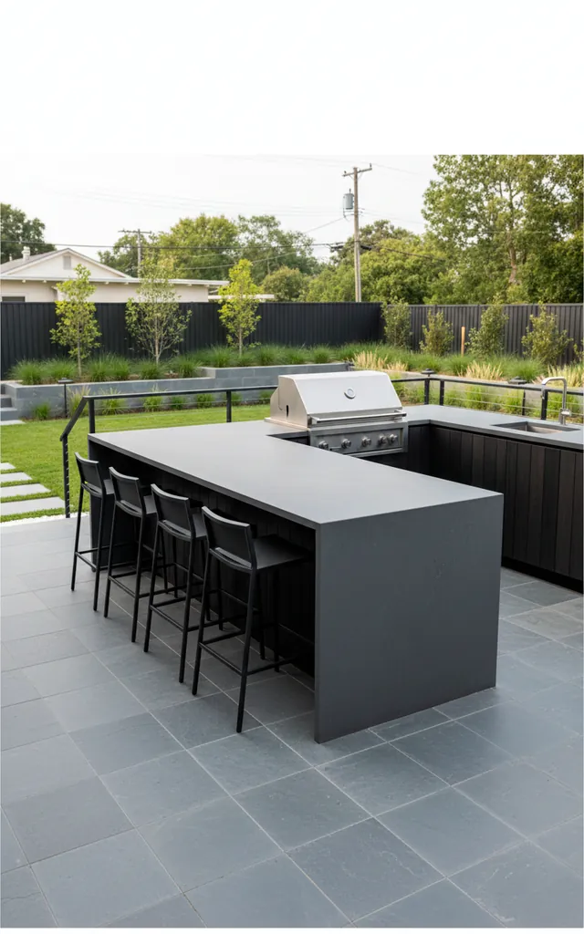 If you love hosting, a slate-toned outdoor kitchen is a massive game-changer. I picked a grey quartz countertop for my grill station to match the porch floor perfectly. It creates a carved-from-a-single-block look that feels incredibly sophisticated and intentional. Who says the kitchen should stay inside? This setup makes meal prep feel like a vacation every single weekend. Just add a few matte black barstools and you have the ultimate entertainment hub.