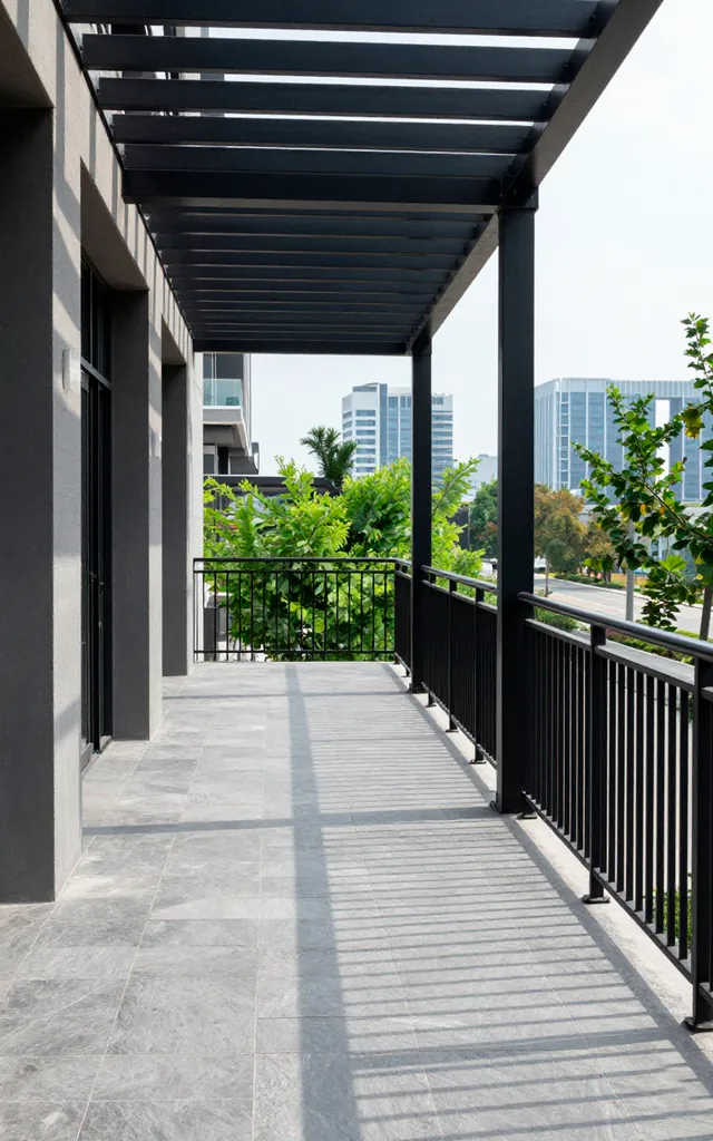 Slate grey provides the perfect backdrop for industrial elements like powder-coated steel. I recently helped a friend install matte black aluminum railings against their slate floor, and the result was stunning. The sharp lines create an architectural edge that screams contemporary living. Why go for traditional wood when metal offers better durability and zero splinters? It requires no staining and looks fresh for decades. Bold charcoal furniture completes the look without clashing with the landscape.