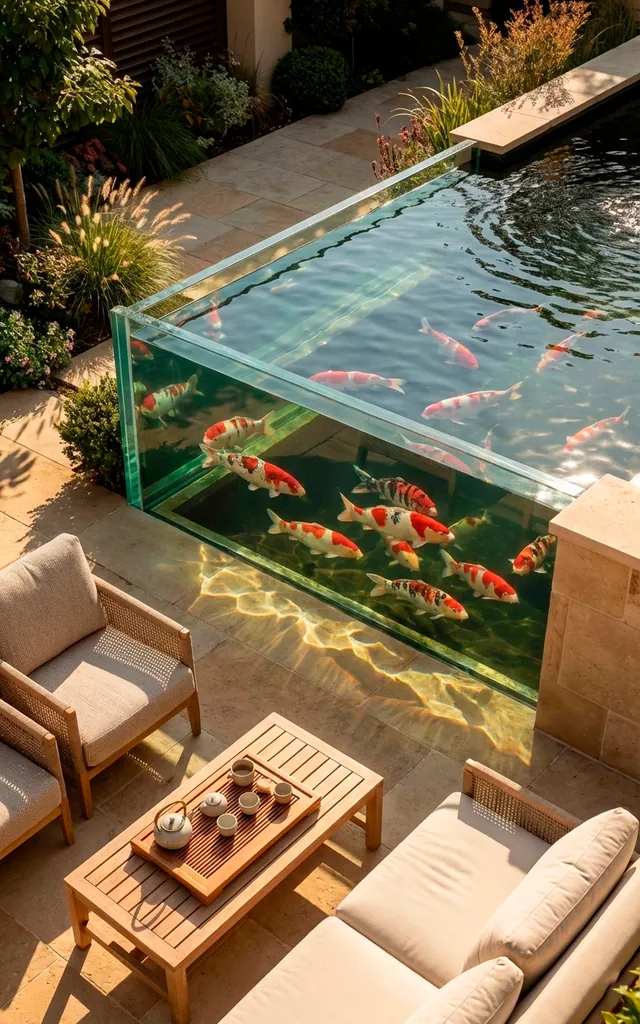 Why hide your prize-winning koi behind murky liners? A glass-walled pond turns your outdoor room into a live-action aquarium. I personally find that seeing the fish from a side-view perspective adds an architectural depth that standard ponds simply lack. It feels sophisticated and modern without trying too hard.