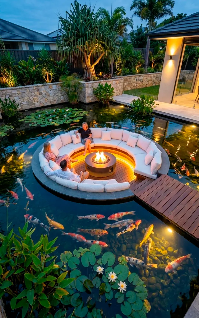 Imagine sitting around a fire pit with the water line at eye level. Sunken lounges create an intimate connection with the pond environment. I love how this layout forces you to slow down and actually notice the water. It’s like being in a VIP booth at a nature club.