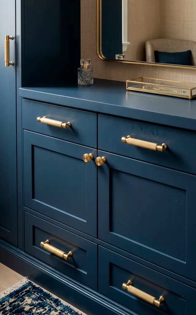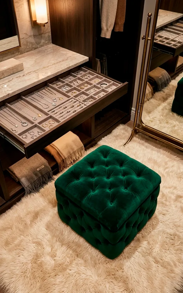 Bring in the textures to kill that cold, closet feel! A velvet-lined jewelry drawer or a small plush ottoman adds instant warmth and class. I chose a deep emerald fabric because it feels expensive even if the price tag was modest. Who knew a bit of fuzz could be so sophisticated? It provides a soft place to land while you’re struggling to put on tights. Luxury is a tactile experience, after all.