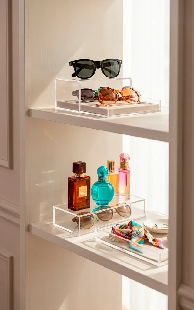 Visual clutter kills the luxury vibe faster than a stain on silk. I use clear acrylic organizers to keep my perfumes and sunglasses on display without blocking the view. It creates a “boutique” look that keeps everything accessible and pretty. Is there anything cleaner than total transparency? It lets your items be the star of the show rather than the bins they sit in. Keep it invisible, keep it chic.