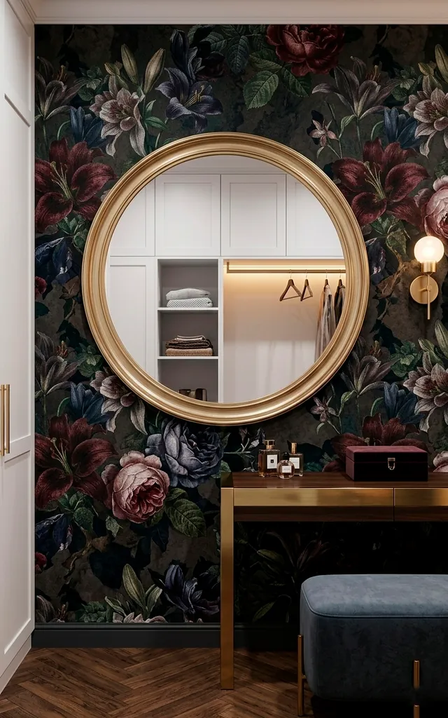 Dark, moody paint or textured wallpaper creates a “jewelry box” effect that I adore. I went with a deep navy floral and suddenly my white clothes popped like a gallery exhibit. It makes the smallness feel intentional rather than cramped. Bold moves pay off in small doses! Why play it safe with beige when you could have a masterpiece? Treat your walls like the canvas they are.
