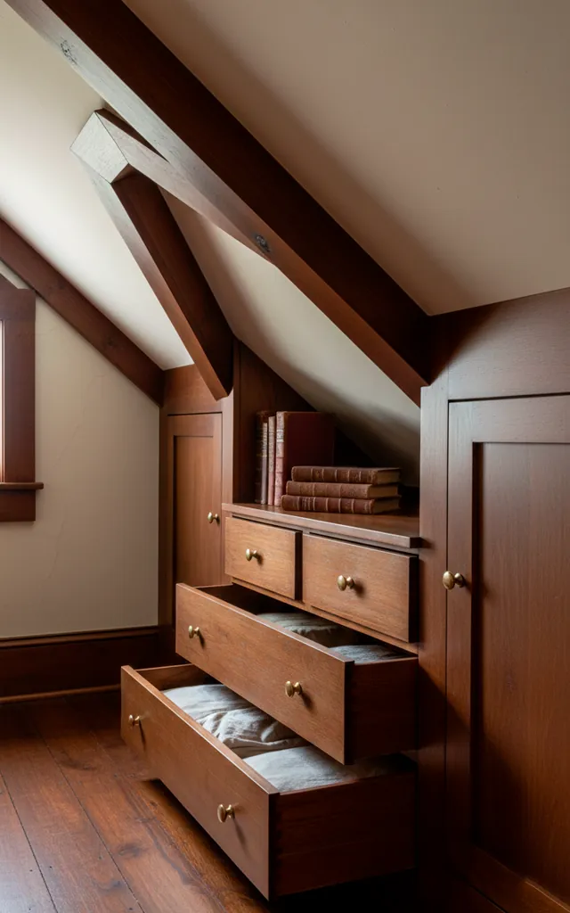 Those awkward sloped ceilings are actually a blessing in disguise. I built custom drawers right into the knee walls to hide all my clutter. It keeps the floor plan open while respecting the original geometry of the roof. Why waste that dead space when you can turn it into a library? Just make sure you don’t block the airflow behind the cabinets. It’s the ultimate way to stay organized without ruining the historic proportions.